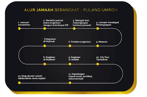 Adapun alur umum perjalanan umroh yang akan Anda lalui bersama MIW meliputi: pendaftaran dan konsultasi paket, pengurusan dokumen (paspor, visa, vaksin), pelaksanaan manasik umroh, keberangkatan ke Tanah Suci, pelaksanaan ibadah umroh (ihram, tawaf, sa’i, tahallul), city tour ke tempat-tempat bersejarah, dan kepulangan ke Indonesia.